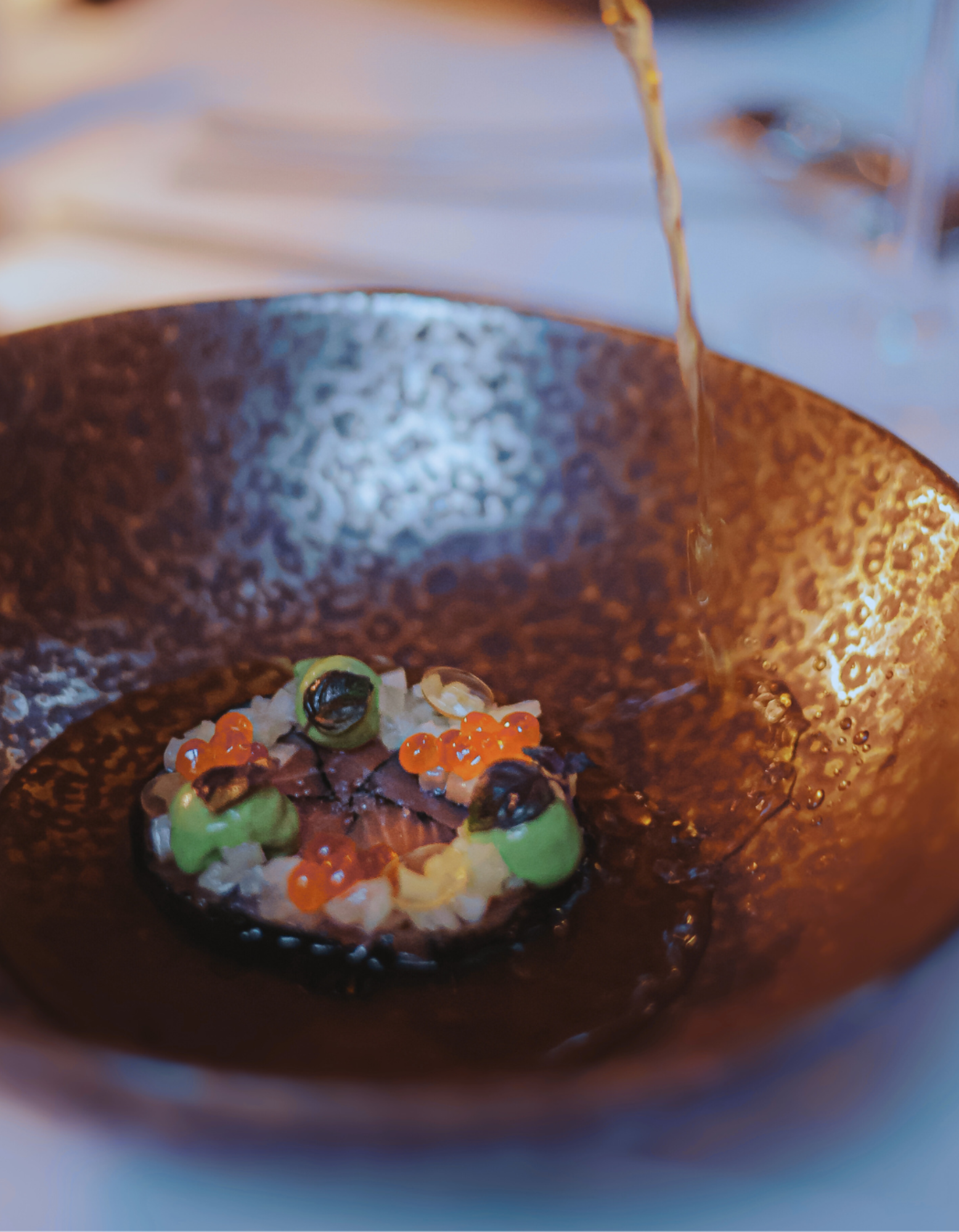 Saumon cendré aux algues, échalotes grises confites, œufs de saumon, gel de vinaigre, condiment hijiki-estragon & consommé miso.